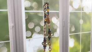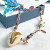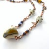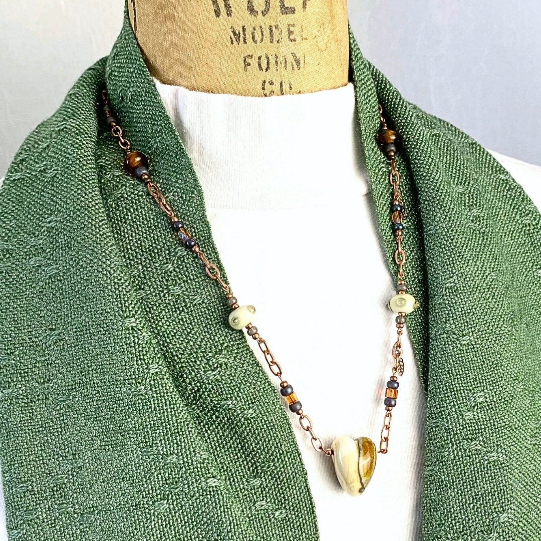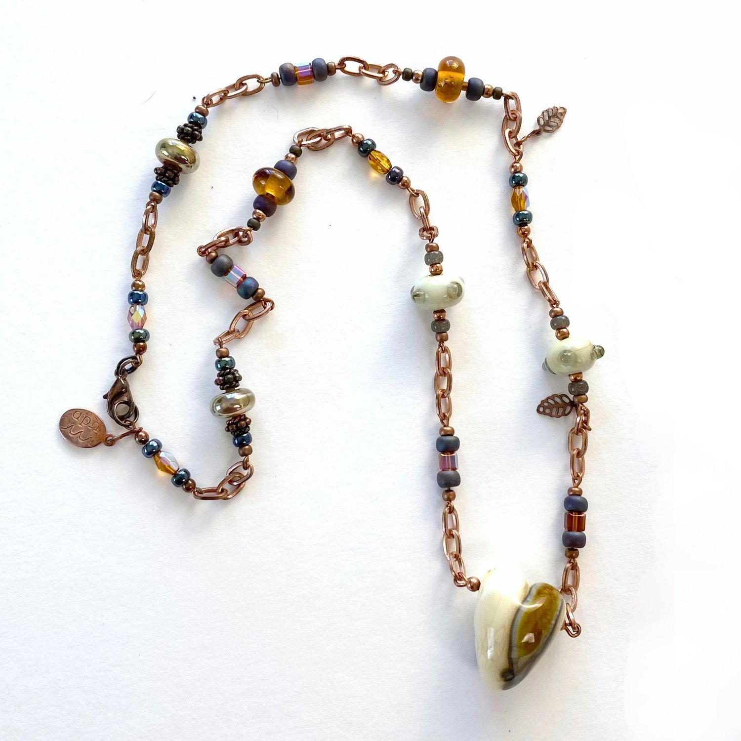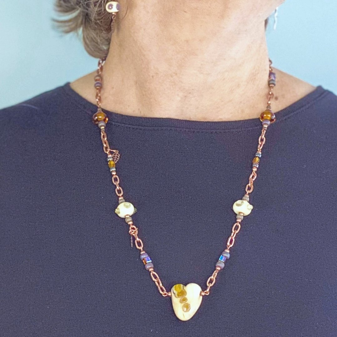 Let her know she is special to you. Gentle swirls of ivory, brown, gold, and "reactive" glass in a lamp-worked heart that is the focal point of this necklace. It is called "Heart of Gold" because it makes a statement about someone with a heart full of love, giving, and gratitude. An ideal gift for your sweetheart, mother, Mother of the Bride, Bride's Maid, or a dear friend with a "Heart of Gold". Alternatively, it would be a great divorce gift; new start, new heart! The reactive brown glass has a chemical makeup that causes the ivory glass to create the dark grey/teal swirls. Plus, when the mix of gas and oxygen is altered in the flame of my torch you can tickle out some hints of grey, lavender, and caramel from the same brown. True alchemy! The beads, copper chain, and crystals add warmth and provide a subtle touch of glint and shine as they catch the light. Elegant and casual at the same time.
