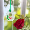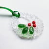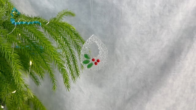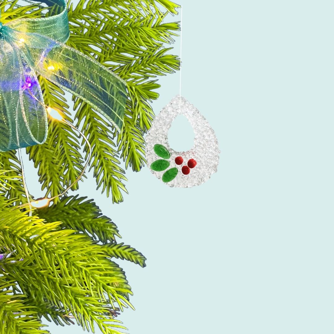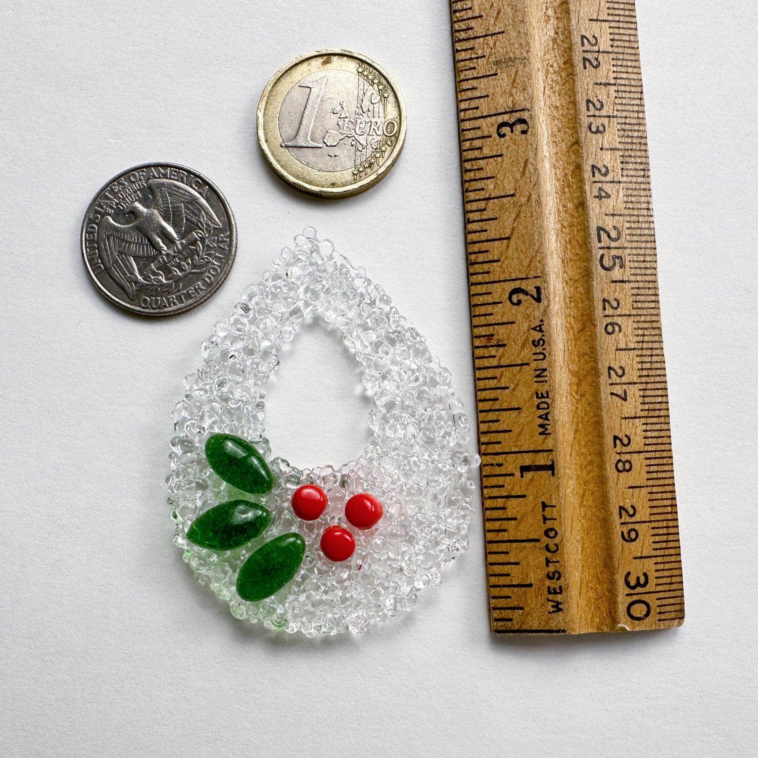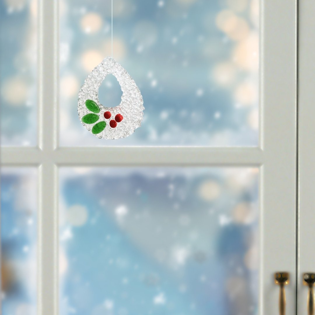 Decorate with this beautiful fused glass ornament for the winter holidays or as a sun catcher any time of year. Transparent clear glass wreath with the look of fresh ice, embellished with green leaves and red holly berries. The slightly druzy texture gives a delicate, icy touch while also adding pizzaz to your holiday decor as it catches the light from multiple angles. An ideal gift for someone special, a holiday hostess, teacher, or co-worker. This Sun Catcher or ornament is a clear glass wreath with green leaves and holly berries. They will reflect the lights on your tree, from your candles, or sun through a window, turning your room into a wonderland. I confess to having several of them hanging around my house all year long. Hang them from the tree, in a window, from the chandelier, from track lighting rails, anywhere you can think of! You can even wear it as a pendant on a decorative cord (cord not included).