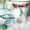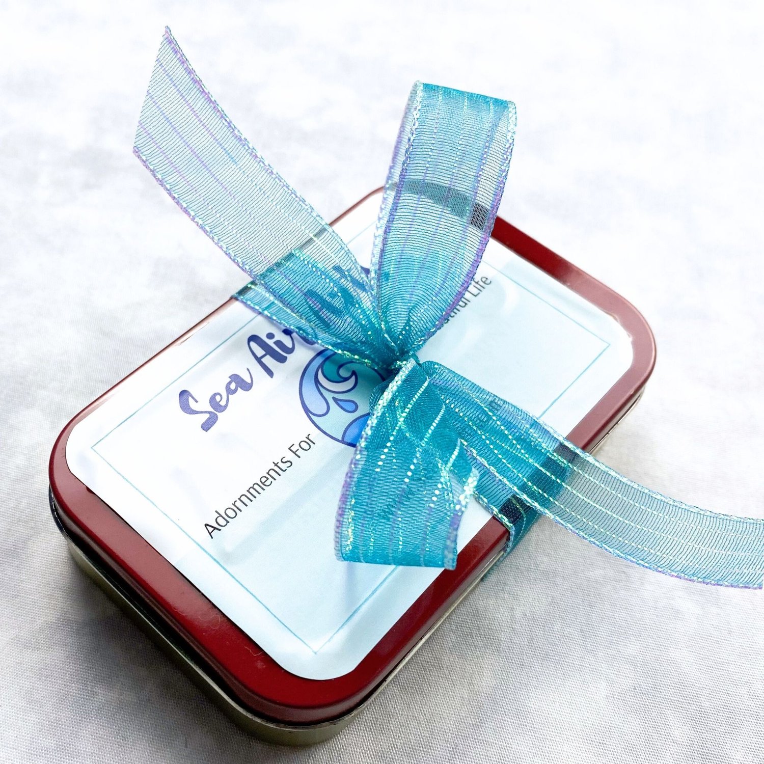 Each ornament comes with its own green ribbon hanger and an extra hanger of clear monofilament (fishline) in case you prefer the floating-in-air look. They are packaged in a recycled candy tin (usually Altoids tins, we seem to have a lot of them) with my logo stickers, recycle and donation sticker, and a business card (no prices). Carefully padded and wrapped in decorative tissue paper for protection. Packaged in a padded envelope for shipping, the tin is sturdy and only the most determined elephant should be able to break anything.