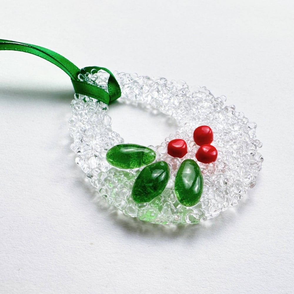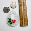 Holly Wreath Fused Glass Christmas Ornament or Sun Catcher, Holly design on clear glass wreath, gift for aunt, grandma, or teacher