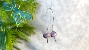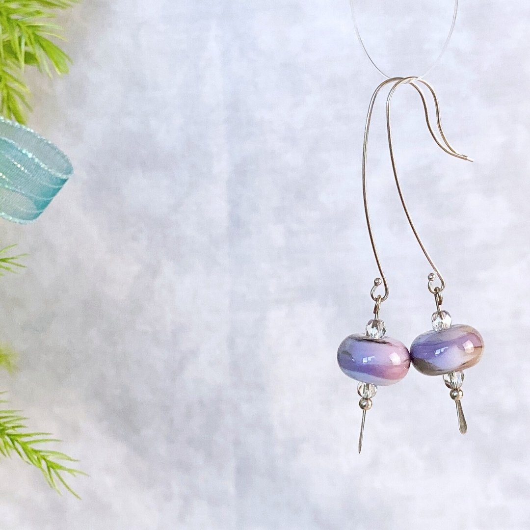 Lavender and cream glass bead earrings. Lamp-worked beads are handmade by me in my home studio. Dangle earrings for pierced ears. Each has a lamp-worked glass bead in lavender and cream with dark streaks where the colors touch and a chemical reaction takes place while melting the glass. Additional elements of clear Swarovski crystals and sterling silver seed beads on sterling silver wire. They hang from sterling silver hook-style ear wires with a rubber "bell" ear nut. Each earring has a total length of 2 ½" (6.35cm). They can dress up jeans or perfectly pair them with a dress for more elegant occasions. A little Boho, A little Art Nouveau. Perfect for a grand adventure, a romantic evening, or as a gift to someone dear to you.