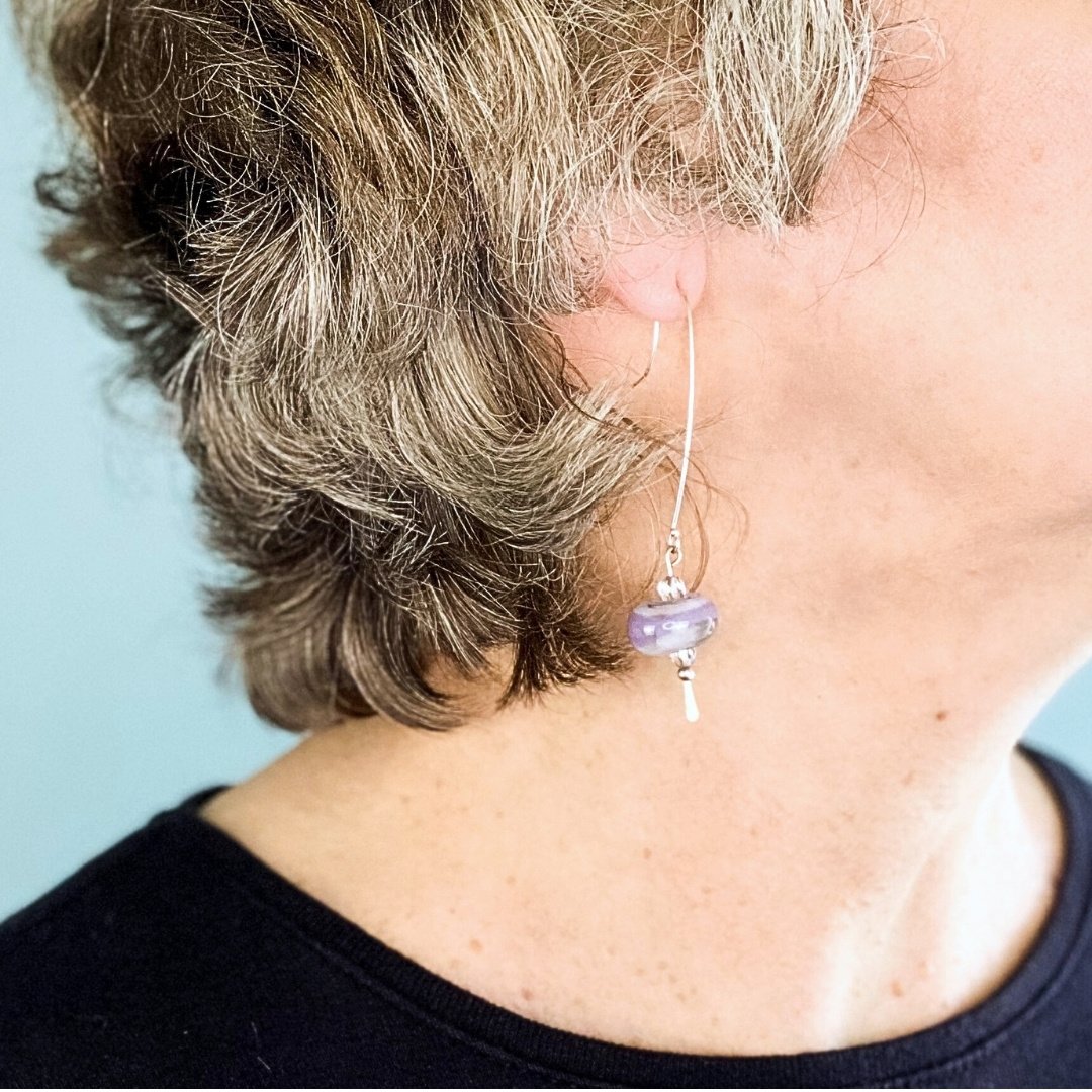 These lamp-worked glass earrings were designed, torch-shaped, and annealed in a programmable kiln by me, in my home studio. Great care is taken to produce jewelry that will endure and wear well. As an avid jewelry wearer myself, I won’t sell something that I wouldn’t love to wear too!
