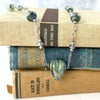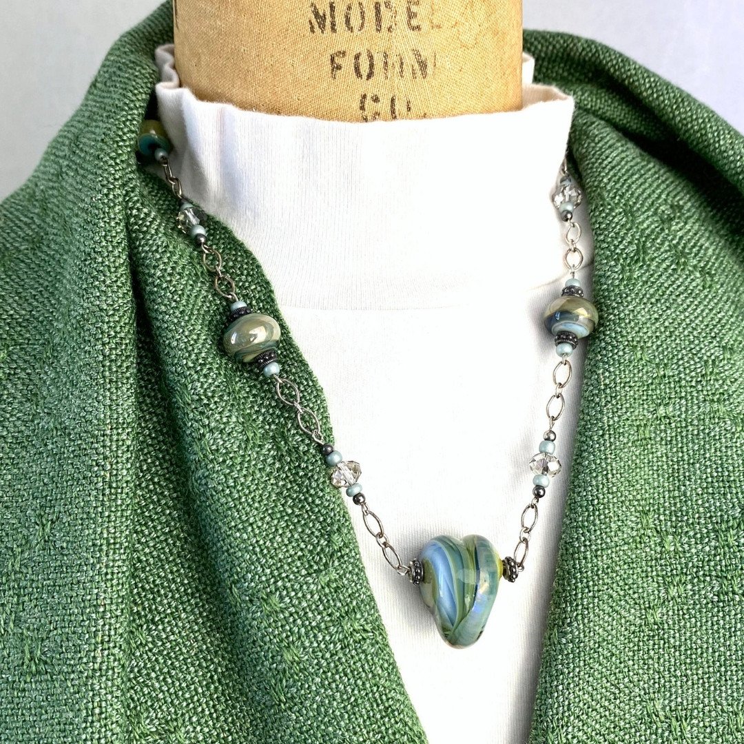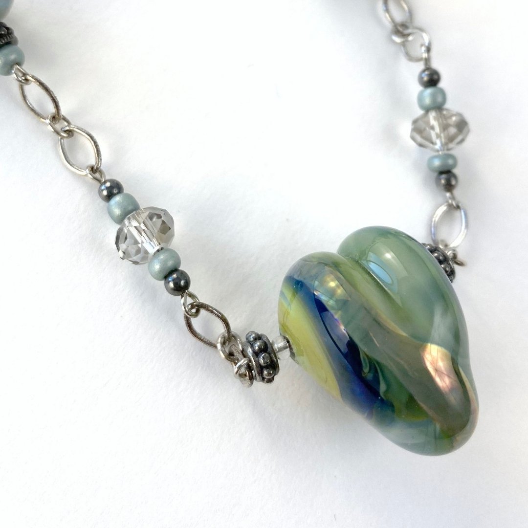 Let her know how special she is. Gentle swirls of sea/sage, greens, blue, gold, and "reactive" glass in a lamp-worked heart are the focal point of this necklace. Called "Heart of Neptune" because the swirls of green are evocative of the calming waters of the ocean. The perfect gift for a loved one suffering from stress, burnout, a broken heart, or even just that special person with a heart that's full! A great divorce gift, new start, new heart. The "reactive" glass gives it a delicate blush of metallic gold when the mix of gas and oxygen is altered in the flame of my torch. True alchemy! The Sterling Silver chain, beads, and crystals provide a subtle touch of shine as they catch the light. Elegant and casual at the same time.