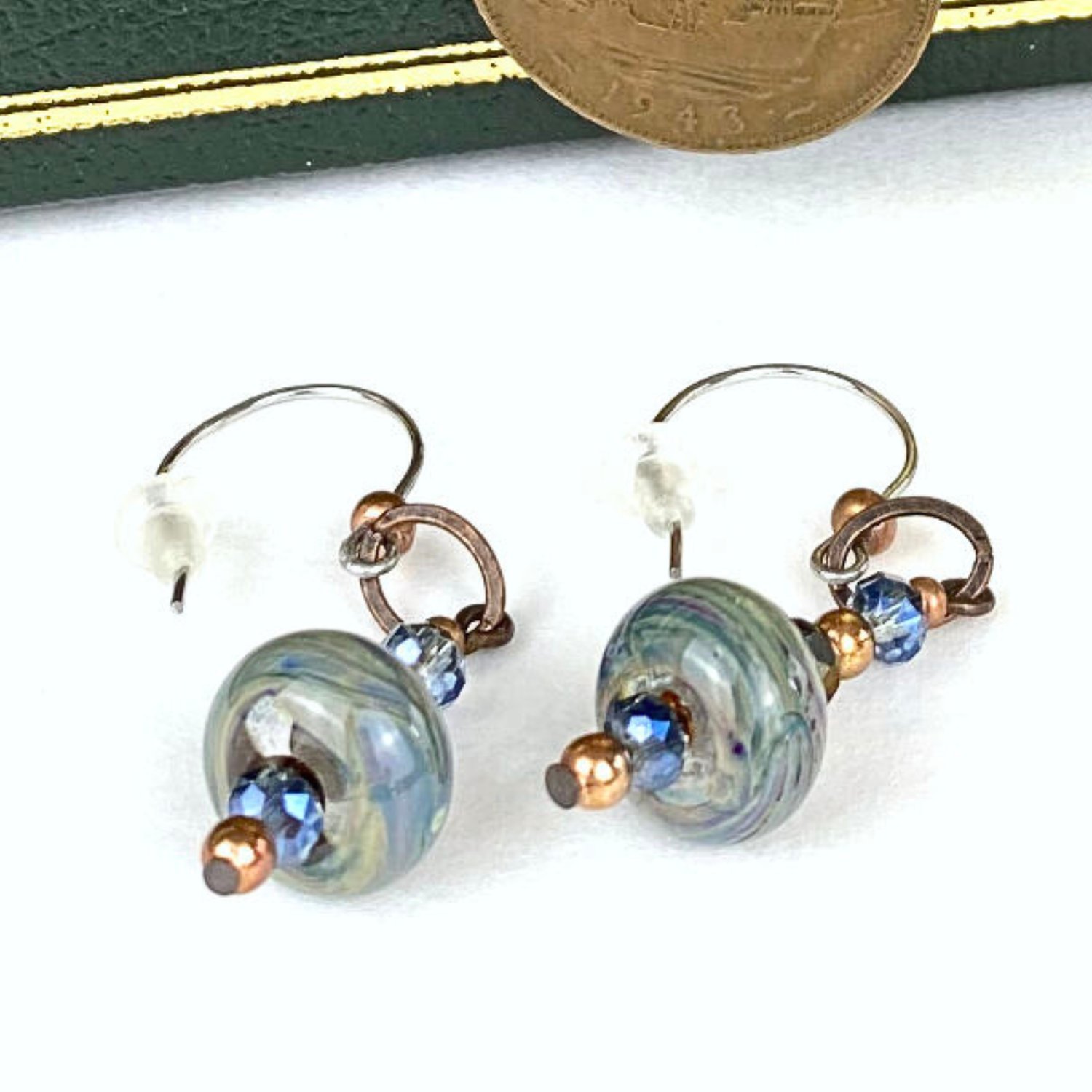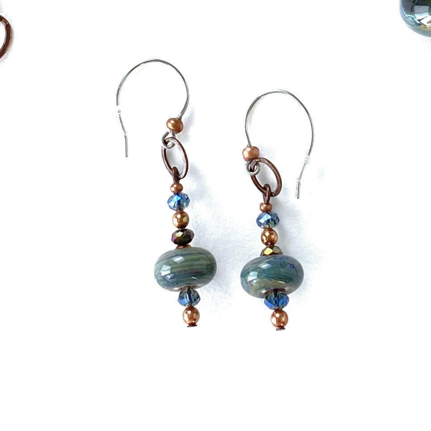 Teal and green glass bead earrings. Lampworked beads are handmade by me in my home studio. Dangle earrings for pierced ears. Each has a lamp worked glass bead in green, teal, blue and copper reactive glass. Additional elements of AB coated crystals and coordinating seed beads. They hang from stainless steel hoop style ear wires with a rubber "bell" ear nut. Each earring has a total length of 2" (5cm). I choose stainless steel because it tends to be the least reactive for people with metal sensitivities. They can dress up jeans or perfectly pair with any dress in ocean colors. A little Boho, A little Art Nouveau. Perfect for a grand adventure, a romantic evening or as a gift to someone dear to you.