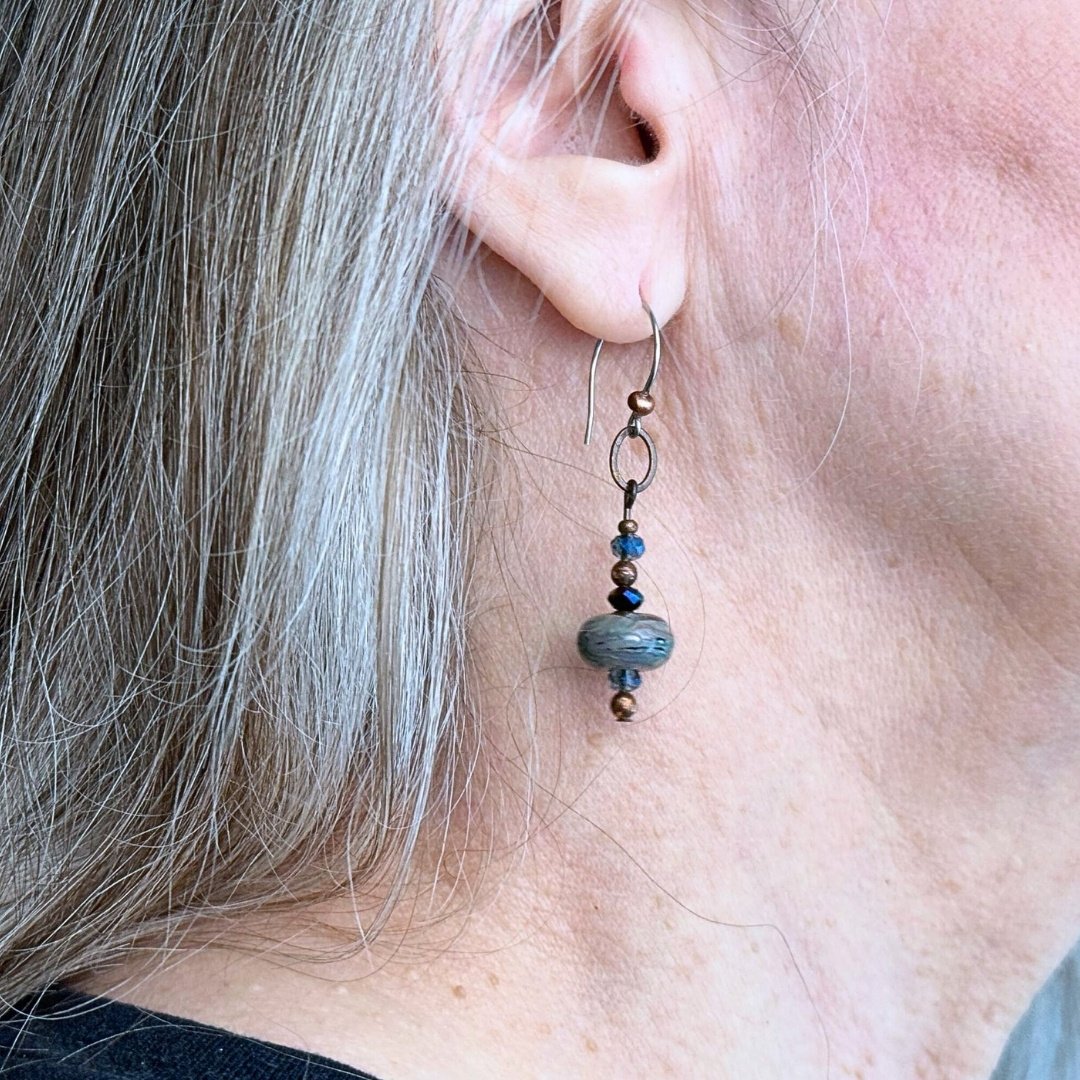 These lamp-worked glass earrings were designed, torch-shaped, and annealed in a programmable kiln by me, in my home studio. Great care is taken to produce jewelry that will endure and wear well. As an avid jewelry wearer myself, I won’t sell something that I wouldn’t love to wear too!